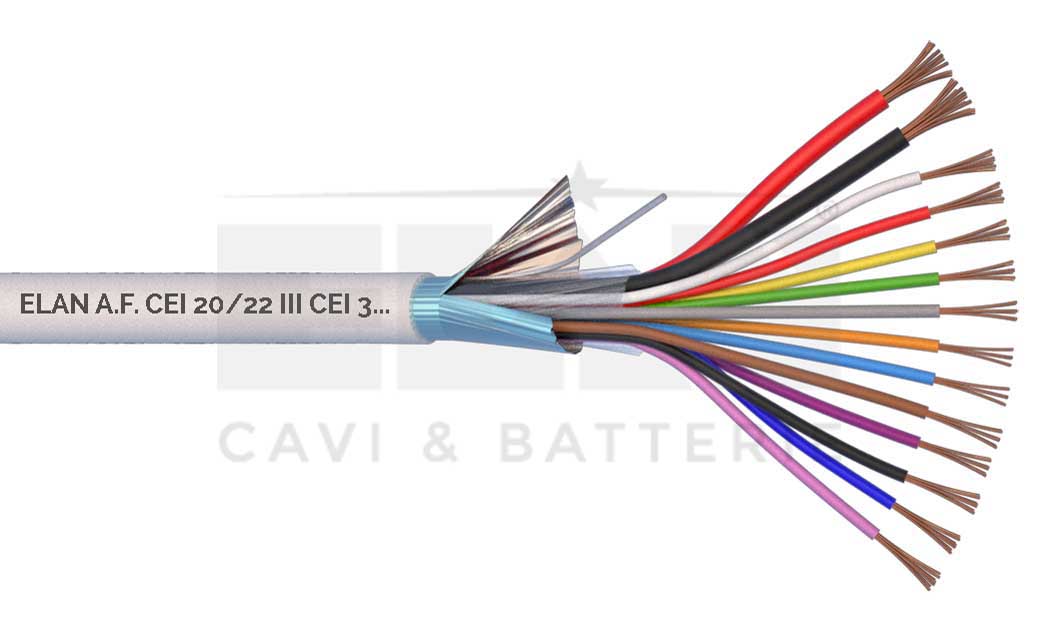 Cavo allarme schermato 2×0,75+12×0,22 per posa e canalette, non propagante la fiamma CEI 20-22. Posa con cavi energia CEI 36762. Conforme CPR 305/11 – EN50575. Guaina esterna in PVC bianco. Matassa da 100 metri in termoretraibile.
